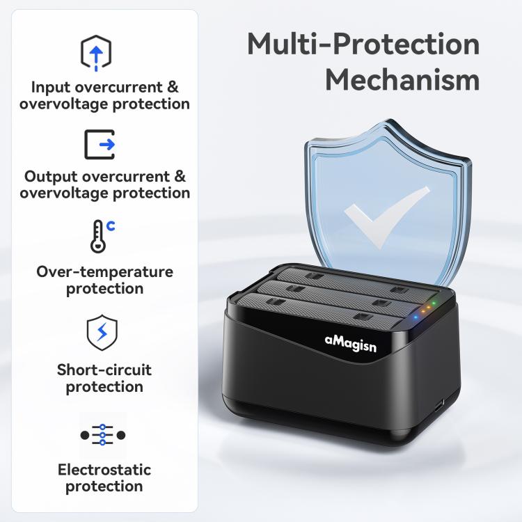 1. Charging dock specifically designed for Insta360 X5 batteries, supports high-speed simultaneous charging for three batteries, and doubles as a portable storage case. Equipped with smart safety technology and a compact design to keep devices fully charged and ready at all times. Features low-power fast charging and automatic shutdown when fully charged.